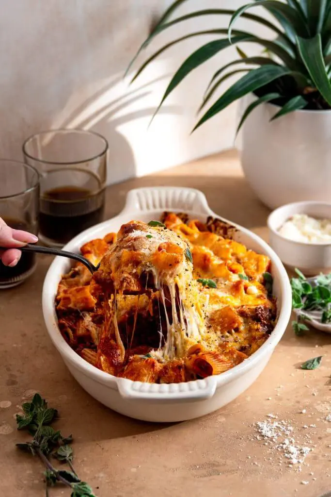 Ik heb voor deze ovenpasta gekozen voor een rigatoni, omdat deze pastasoort lekker groot is en de saus er goed in gaat zitten. Je kunt ook penne oid gebruiken, mocht je dat nog hebben liggen. Verder heb ik een heerlijke tomatensaus gemaakt, dit keer niet met ballen, maar met geruld gehakt. In dit recept van spaghetti met gehaktballen geef ik aan dat ik ballen zoveel lekkerder vind dan geruld gehakt, maar in dit recept past geruld beter.