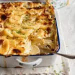 - Vul de ovenschaal met de helft van de aardappelen. Giet hier de helft van de saus op. Verdeel daarna de andere helft van de aardappelen hierover en de andere helft van de saus.