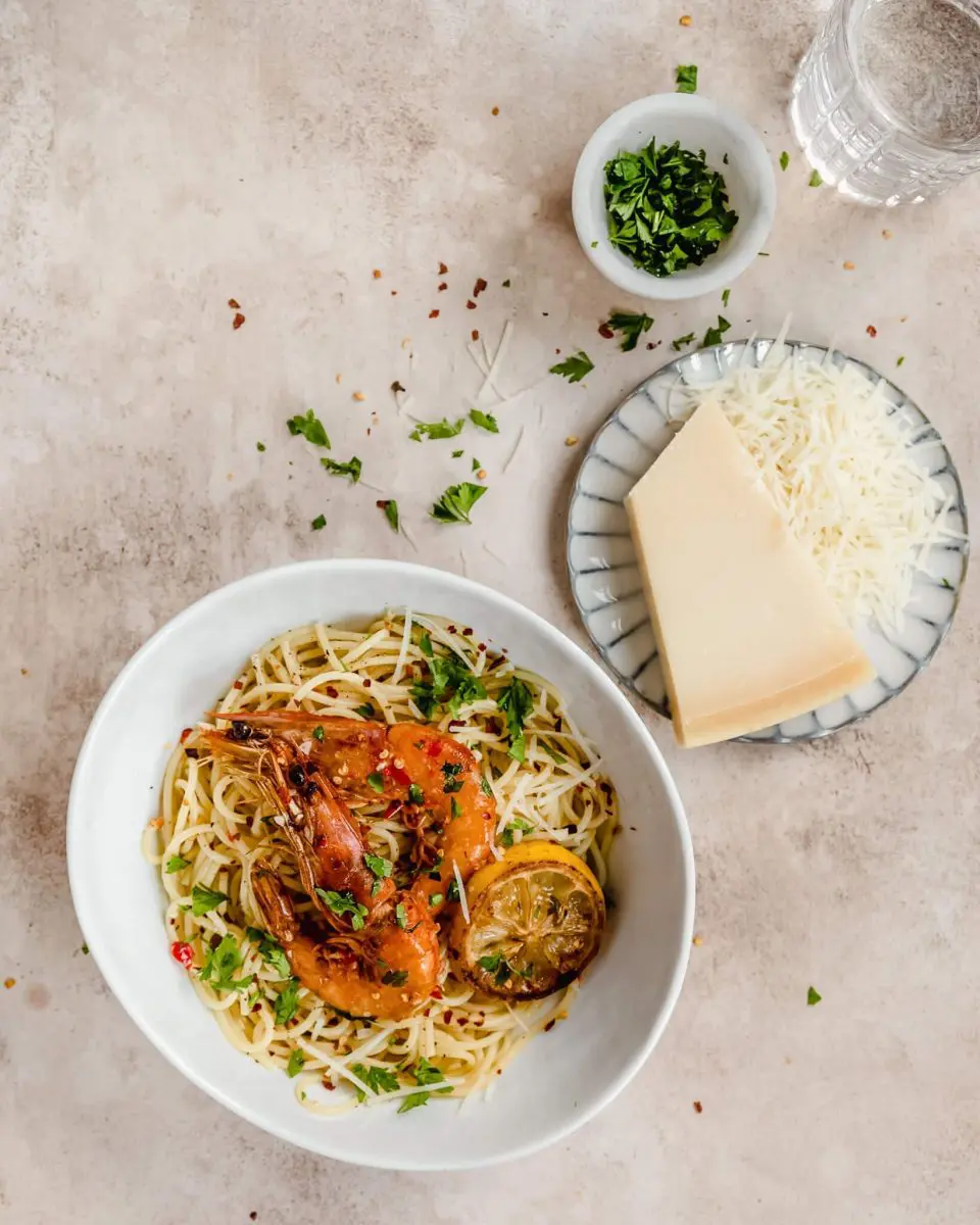 De Italianen zijn er meester in, een topgerecht maken met zeer weinig ingredienten. Denk bijvoorbeeld aan deze cacio e pepe. Dit gerecht is eigenlijk een simpele spaghetti met knoflook en olie, op smaak gebracht met chili vlokken en geserveerd met parmezaanse kaas. Ik doe er nu ook nog garnalen bij want waarom niet?!