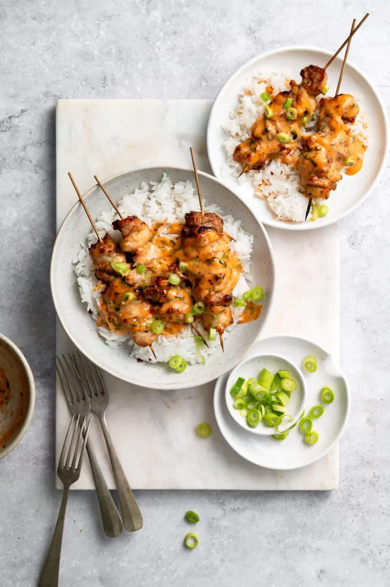 - Dien de kipspiesjes op met gekookte rijst en de saus en garneer met de bosui.