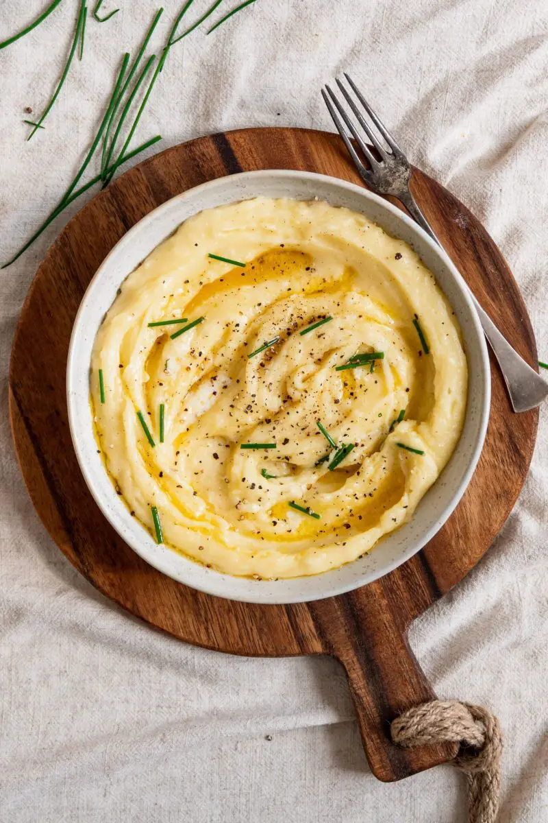 • Serveer over 4 a 6 porties (afhankelijk van hoeveel trek je hebt), verdeel nog wat de overgebleven roomboter over de puree en garneer met versgemalen zwarte peper en verse bieslook.