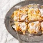 - Bak 20-25 minuten af in de oven tot goudbruin en krokant. Laat kort afkoelen voordat je er poedersuiker en kaneel overheen doet en in stukken snijdt.