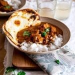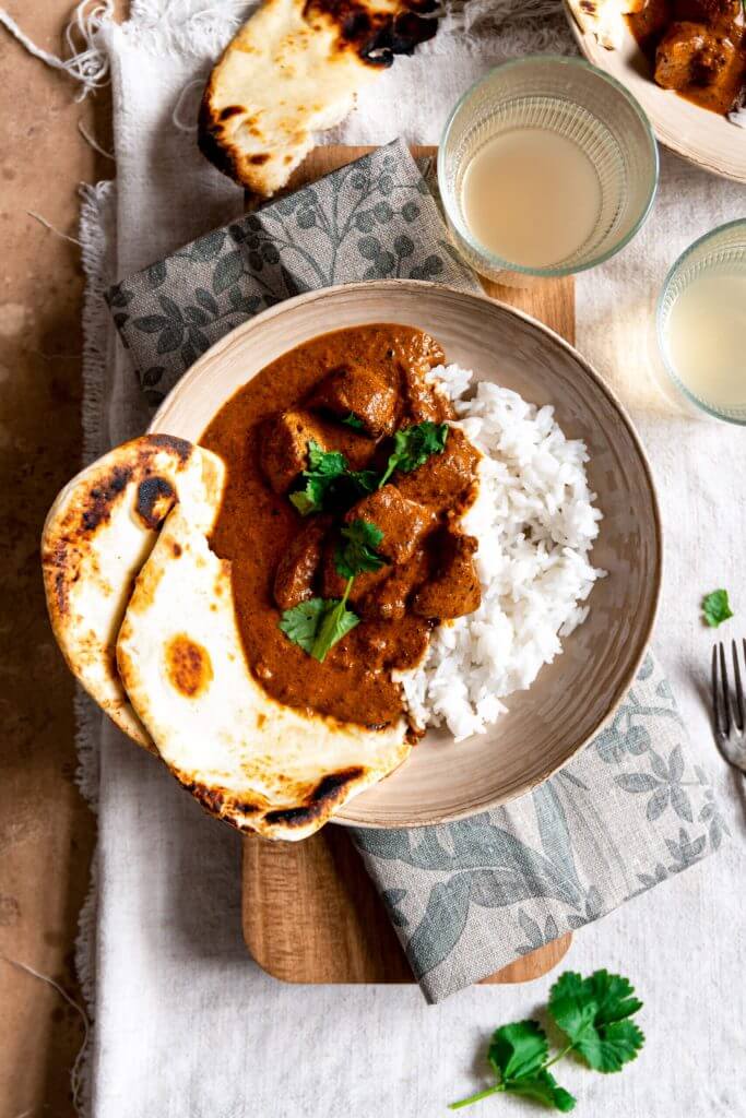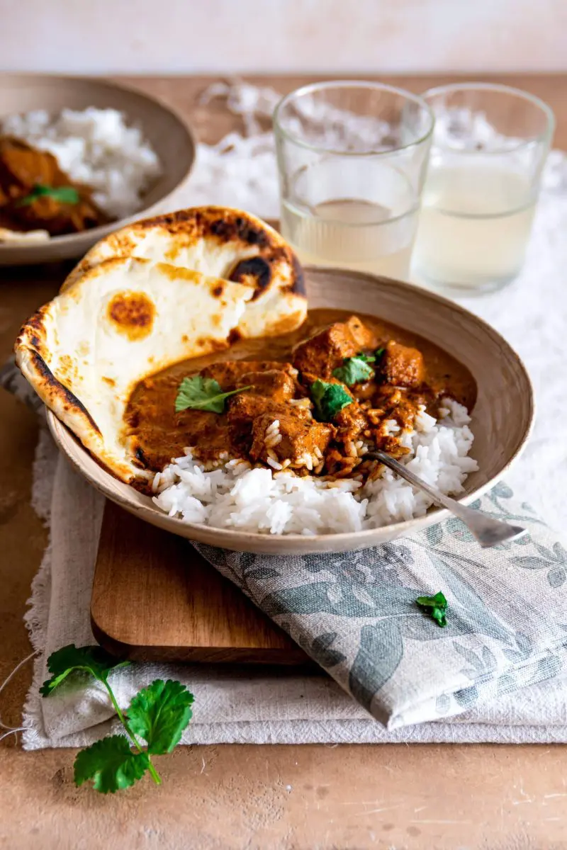 Ik serveer eigenlijk altijd naan bij mijn curry, soms rijst en soms ook niet. Het recept voor zelfgemaakte naan vind je terug in mijn kookboek Vers Deeg, samen met een heerlijke halloumi curry en een meer pittige curry.