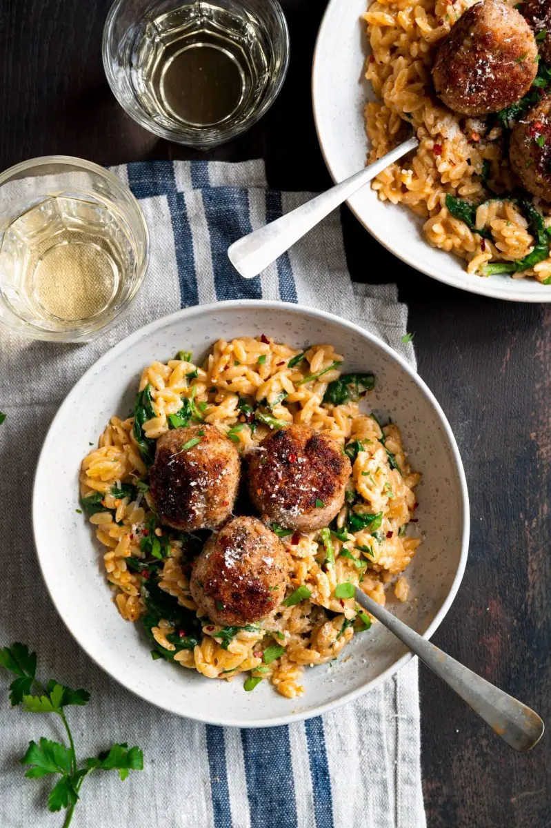 - Voeg de roomkaas, parmezaan en spinazie toe en meng door tot de spinazie geslonken is. Voeg indien nodig extra bouillon toe als de orzo te droog is (het droogt nog in wanneer het gerecht begint af te koelen). Voeg de kipgehaktballen toe en laat deze weer opwarmen.