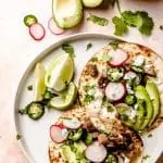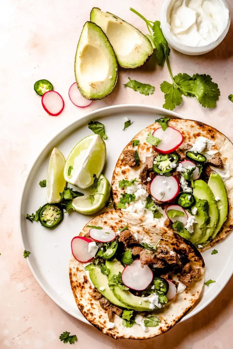 - Verdeel wat creme fraiche over de tortilla en vul met vlees, avocado, radijs, jalapeno, feta en koriander. Serveer met limoen.
