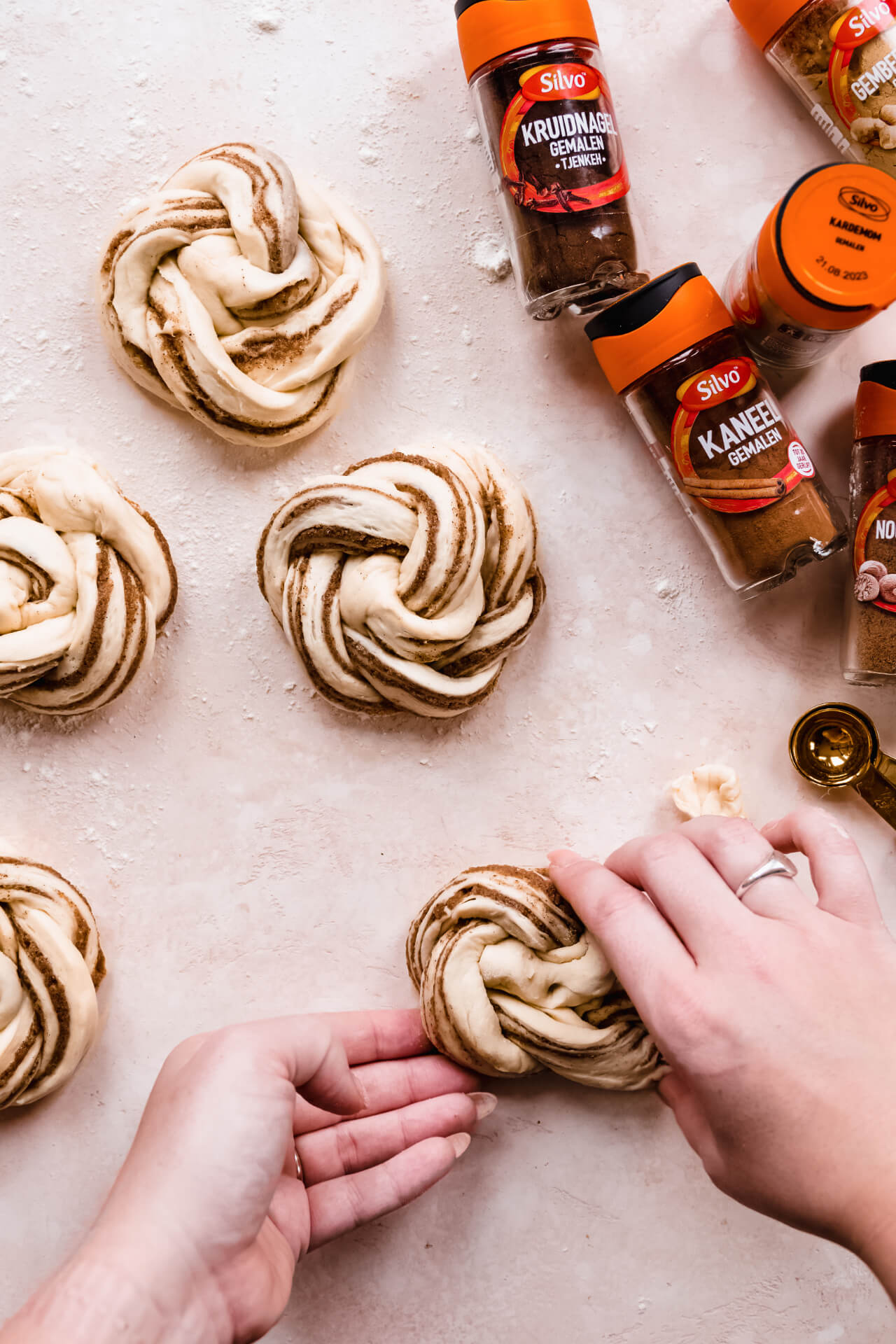 Deze chai kruiden meng je met boter en suiker en hier smeer je het deeg mee in. Vervolgens rol je het deeg op in een sigaar, snij door het midden (maar laat een uiteinden samen) en maak een vlecht met deze 2 strengen. Rol vervolgens deze vlecht op in een broodje. Knijp de andere uiteinde samen en werk weg onder het broodje.