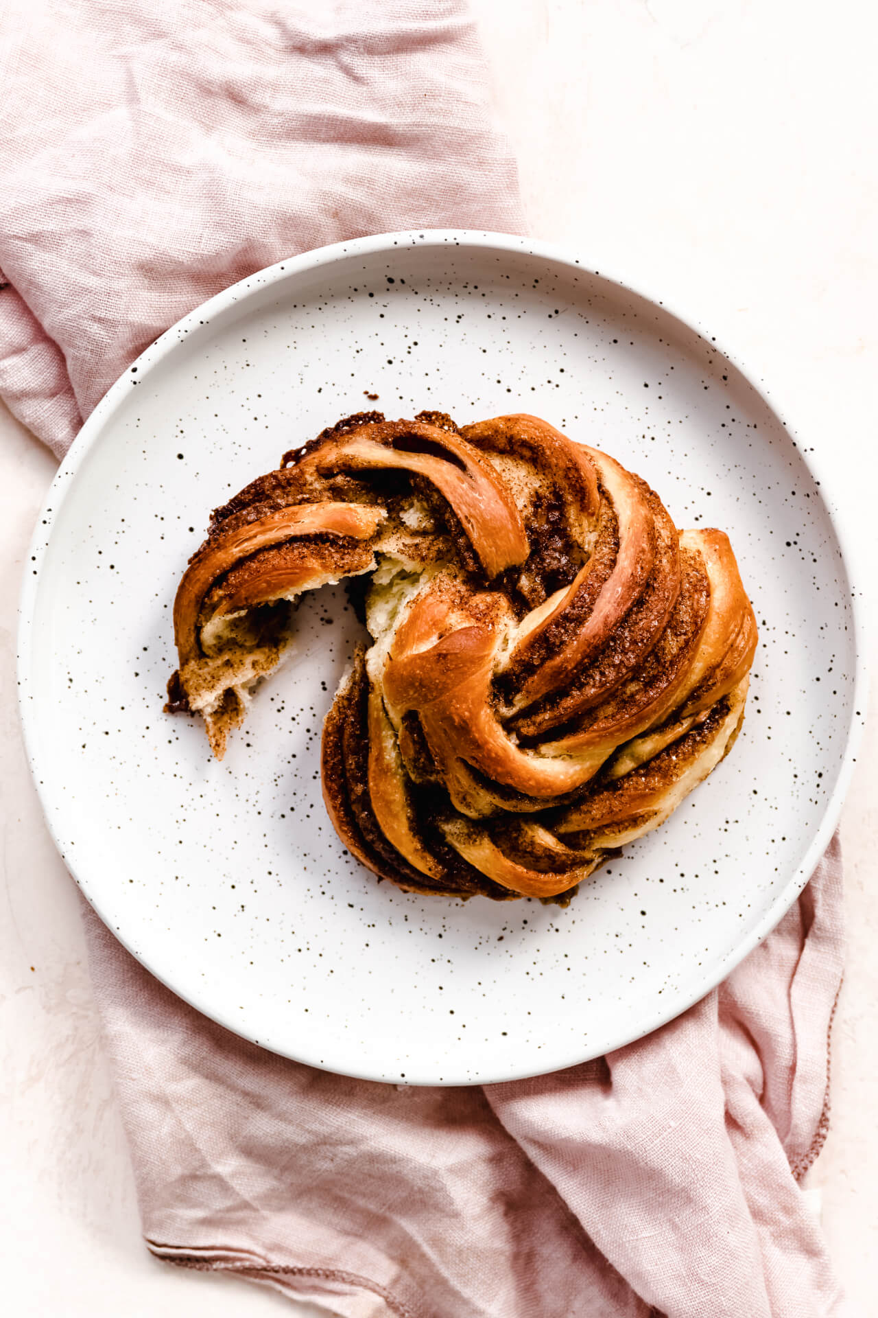 - Verdeel het deeg in 8 gelijke porties van ongeveer 100 gram. Bestrooi het aanrecht met wat bloem en rol de eerste portie uit tot een langwerpig lapje. Smeer in met wat chai boter. Rol op tot een sigaar en snij met een scherp met door de lengte door midden (maar laat het uiteinde aan elkaar). Je ziet nu al die mooie strepen! Draai de twee strengen om elkaar heen, knijp de andere uiteinde samen en rol de streng van links naar rechts op tot een broodje. Stop het uiteinde onder het broodje weg.