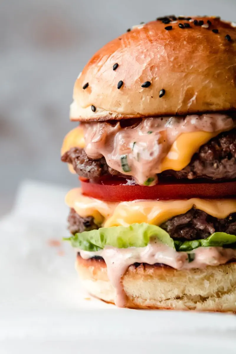 Dubbele cheeseburger met gekarameliseerde ui saus