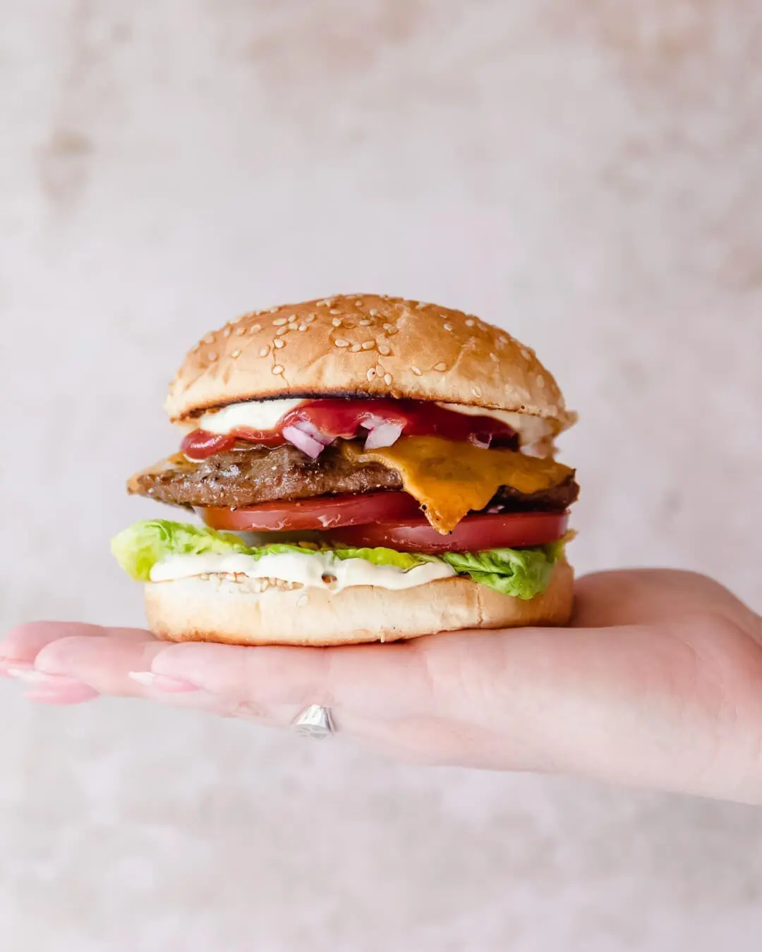 - Beleg de broodjes eerst met 1 tl mayo, dan sla, dan tomaat en dan de burgers met cheddar. Smeer de bovenkant van het broodje in met de andere tl mayonaise en ketchup en verdeel de rode ui hierover.