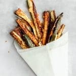 Ik doe aan intermittent fasting dus sla het ontbijt over en de hapjes zijn dan mijn lunch. Dat scheelt al! Wat ook een goed idee is, is groenten verwerken in je snacks. Zoals deze courgette friet! Een crunchy buitenkant met een zachte binnenkant en een heerlijke tzatziki dip erbij.