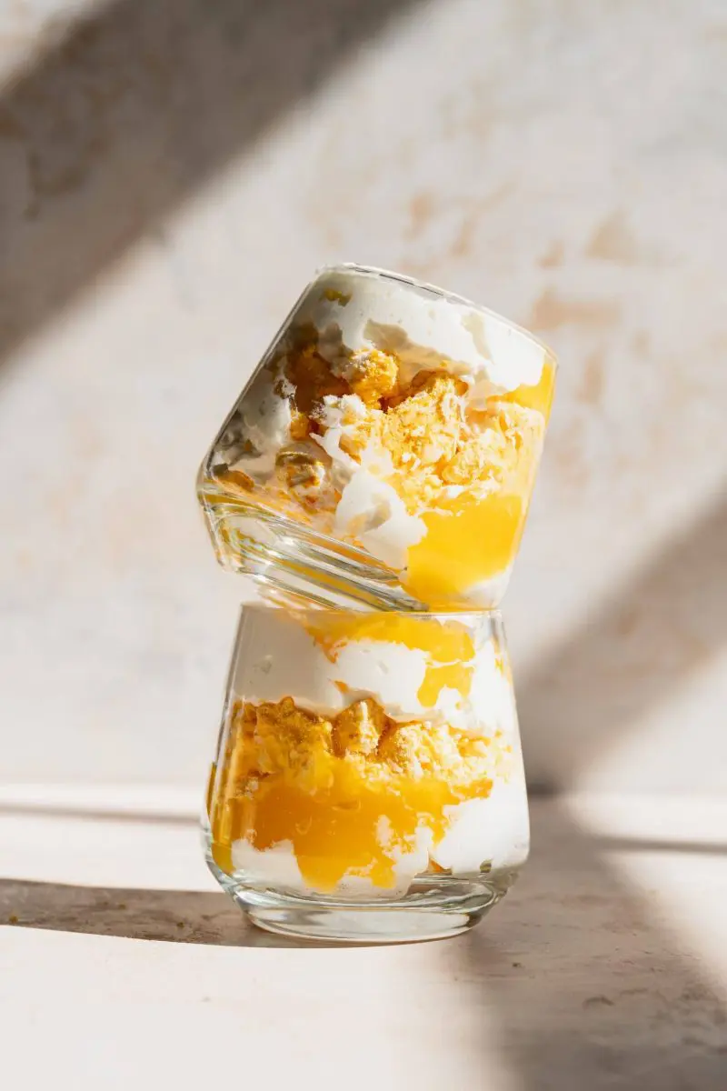 - Verkruimel de meringue en verdeel een laagje over 2 glaasjes. Verdeel hier bij allebei de glaasjes een eetlepel lemon curd overheen en dan wat slagroom.