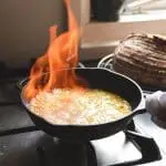 Het is niets meer dan gebakken kaas afgeblust met metaxa en dat geflambeerd, maar het ziet er wel spectaculair uit én is dus lekker makkelijk. Misschien vind je het idee van flamberen eng, maar geen zorgen. Houd eventueel een deksel paraat. Worden de vlammen te hoog, leg dan een deksel op de pan. Bij mij duren de vlammen meestal maar een paar seconden, daarna doven ze vanzelf weer.