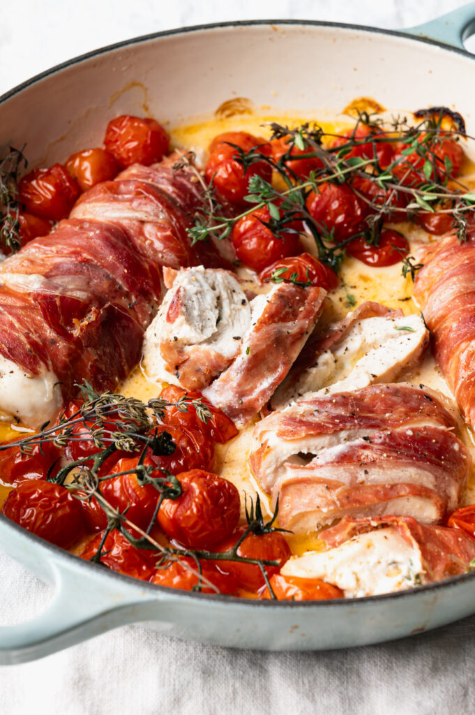 - Bak ongeveer 20 minuten af in de oven, tot de Jamón ConsorcioSerrano krokant is ende kip gaar is. Dit is wel afhankelijk van hoe groot en dik je kipfilet precies is, dus houd het in de gaten.