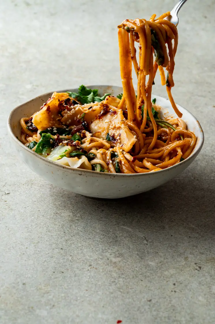 De gochujang dumpling noodles staan snel op tafel en is perfect als doordeweekse maaltijd of comfort food na een lange dag. Serveer het af met wat crispy chili olie voor extra smaak en textuur en je hebt een bowl die je gegarandeerd nog eens wilt maken.