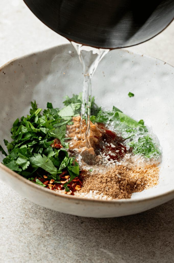 • Doe de gochujang, pindakaas, koriander, knoflook, chiliflakes, sesamzaad en verse koriander op een bord. Verhit de olie en schenk dit erbij, roer door. Voeg een juslepel kokend water toe en meng door. Voeg de noodles, dumplings en paksoi toe, meng alles nog even door en garneer met crispy chili olie (indien gewenst).