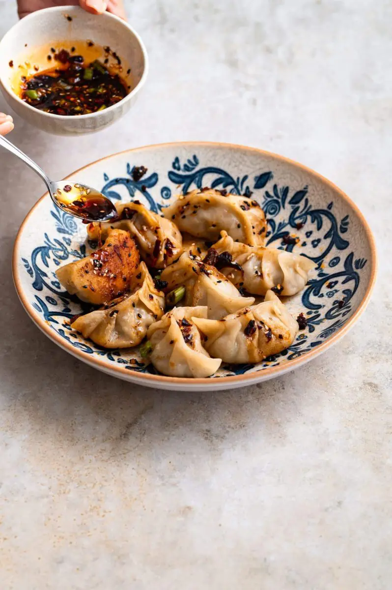 Vervolgens verhit je wat olie in een koekenpan en bak je de gyoza totdat de onderkant goudbruin is. Voeg dan een scheut water toe en laat met deksel stomen, zo’n 2 minuten.