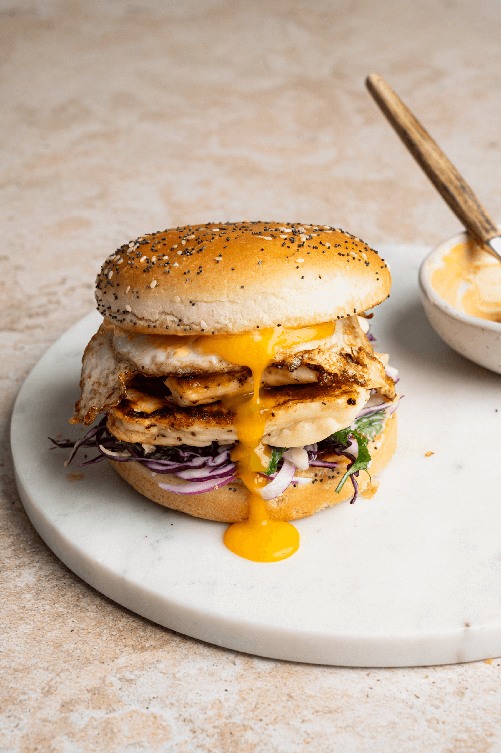 • Beleg het broodje met sriracha mayo, koolsla, de halloumi en dan het eitje. Smeer de andere kant van het broodje ook in met sriracha mayo en leg op het ei. Dien direct op!