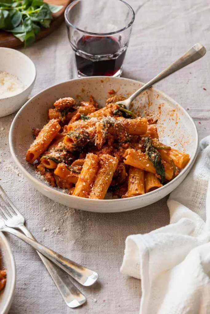 De reden dat ik het liefst een Dutch oven gebruik is vanwege deze veelzijdigheid. Ik heb veel recepten waarmee ik begin te koken op het fornuis en vervolgens het gerecht afmaak in de oven (denk aan een ovenpasta zoals deze met kip en pesto). Ik hou er niet van om én een pan én een ovenschaal te moeten gebruiken. Daarnaast vind ik de deksel ideaal want je kunt een gerecht eerst met deksel bakken tot de kaas gesmolten is en het gerecht gaar is en daarna kort zonder deksel tot de kaas goudbruin is. Dek je de kaas niet af dan bakt deze vaak te hard en wordt het kroktant. Dat vind ik met pastagerechten vaak niet ideaal.