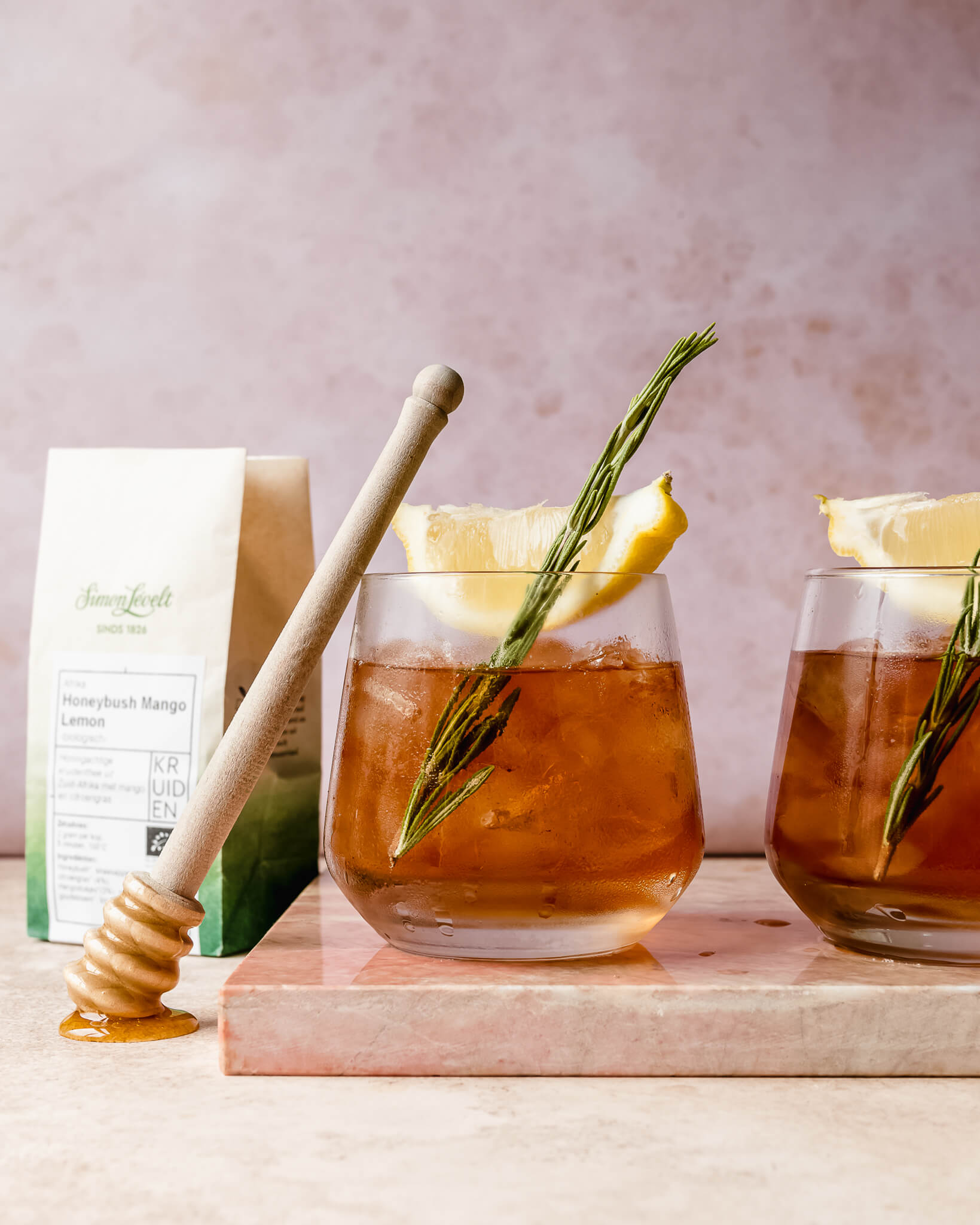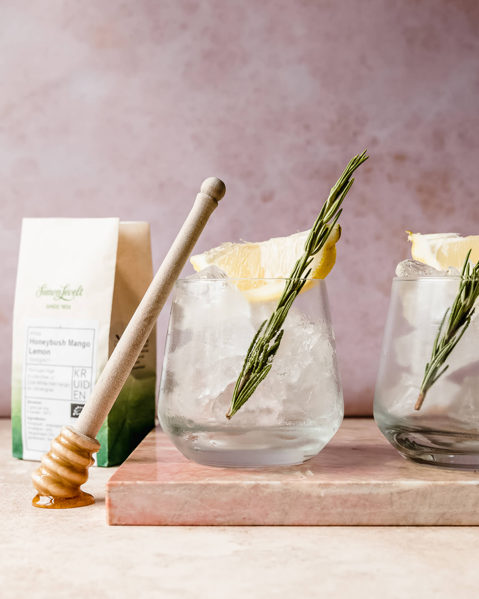 Mijn theekeuze voor deze ijsthee is de Honeybush mango lemon. Deze heeft geen theïne waardoor je ook geen bittere ijsthee krijgt. Verder werkt de aanwezige mango smaak en geur heel erg goed met de citroen en de rozemarijn. Ik gebruik altijd theefilters met dit soort losse thee, dan heb je verder geen zeefje nodig.
