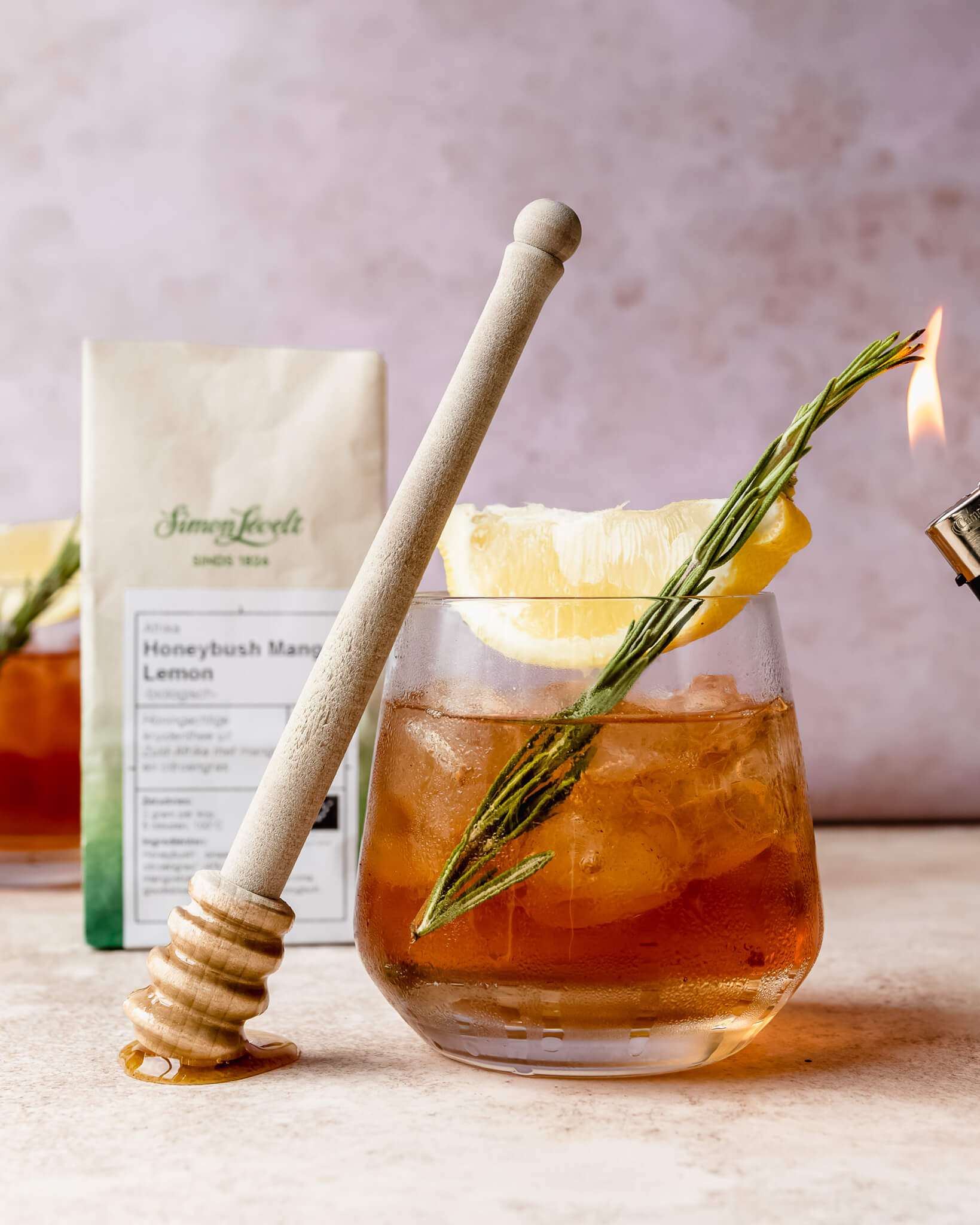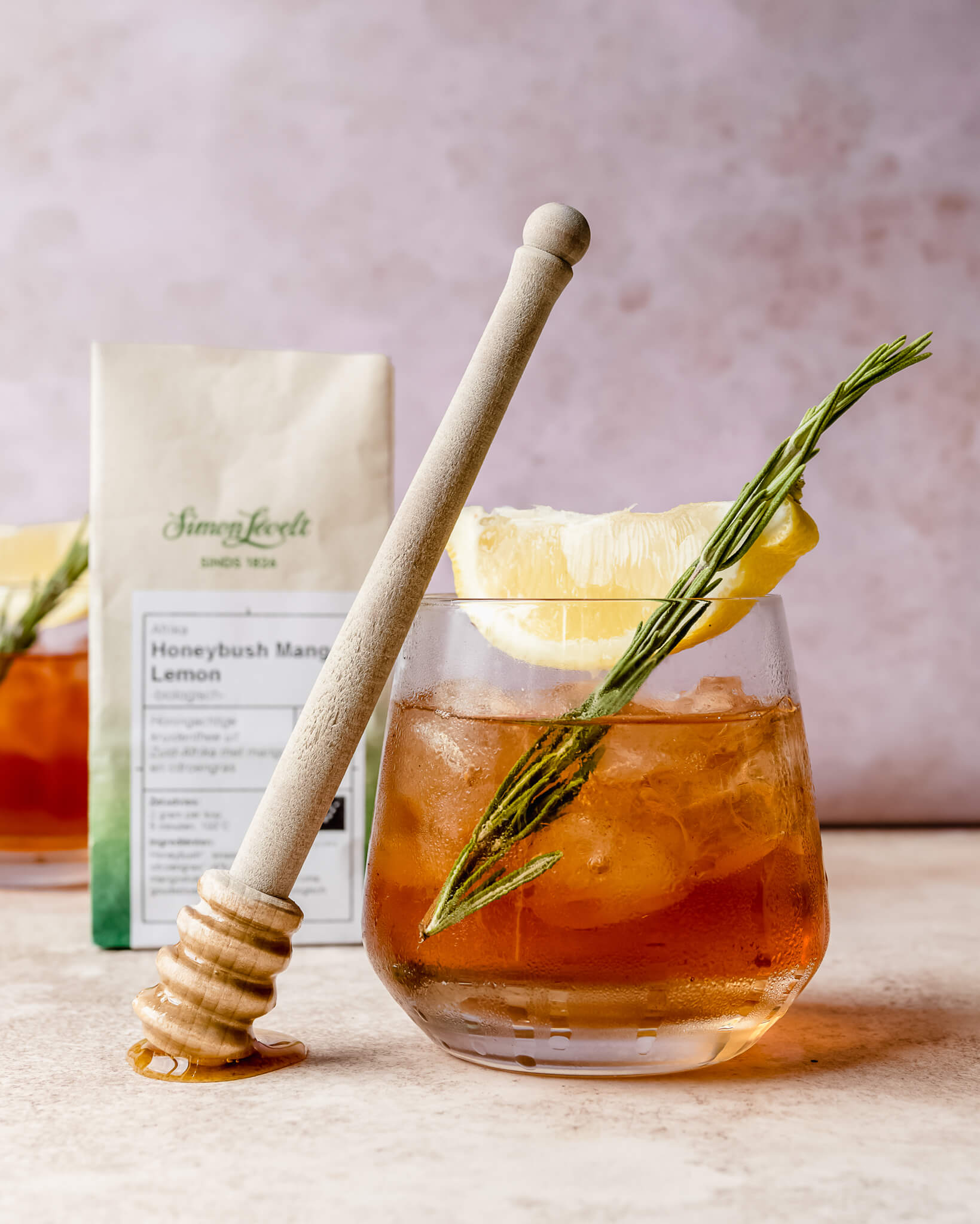 Dit geeft net wat meer diepte aan dit drankje. Ook serveer ik mijn ijsthee met citroen en extra rozemarijn. Wanneer je gasten hebt kun je de rozemarijn aansteken voordat je het opdient. De geur die vrij komt hierdoor is geweldig. Dit is een trucje dat ik heb geleerd in mijn favoriete cocktailbar.