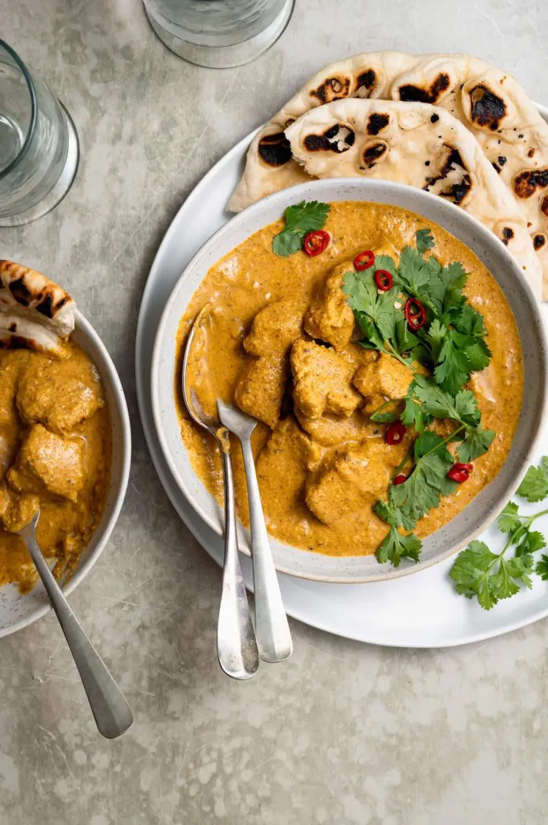 Kip korma is een beetje de guilty pleasure curry. Het is romig en een beetje zoet. Soms heb ik zin in pittig en dan voeg ik een kleine rode currypeper toe aan de saus wanneer deze staat te pruttelen. Ik serveer er naan bij, soms ook rijst want dubbel carbs is dubbel fun.