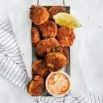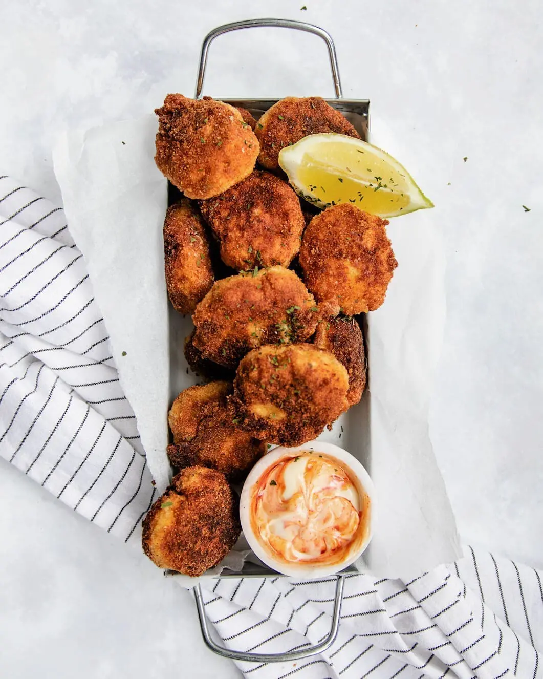 - Laat even uitlekken op wat keukenpapier terwijl je de dip maakt. Meng de mayo met de sriracha. Serveer samen met nog wat citroen voor net dat frisse tintje! Enjoy!