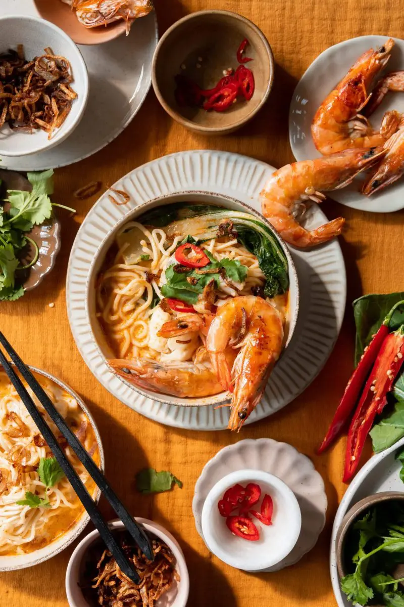- Dien de noodles op in een kom samen met de kabeljauw en pak choi. Verdeel de garnalen, koriander, gefrituurde sjalotten en optioneel wat rode peper eroverheen en dien direct op.