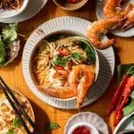 Ik heb zelf gekozen voor kabeljauw en garnalen. Kabeljauw omdat het een milde vis is en je kunt deze laten meegaren in de soep terwijl de noodles koken. De garnalen omdat in de soep ook al een heerlijke garnalen smaak zit, dus dat is een mooie en logische toevoeging. Ik heb wat pak choi ook op het laatst even meegekookt in de soep.