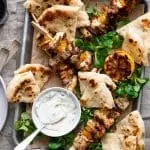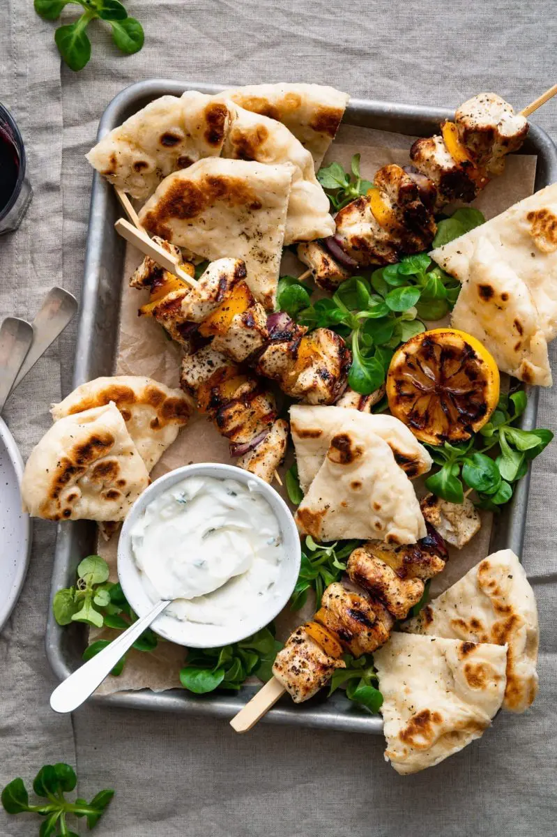 Ik weet dat een recept goed is als ik naast me 3x hoor hoe lekker het is! Lemon pepper kipspiezen, hier geserveerd met een dikke knoflooksaus en homemade Griekse pita’s.