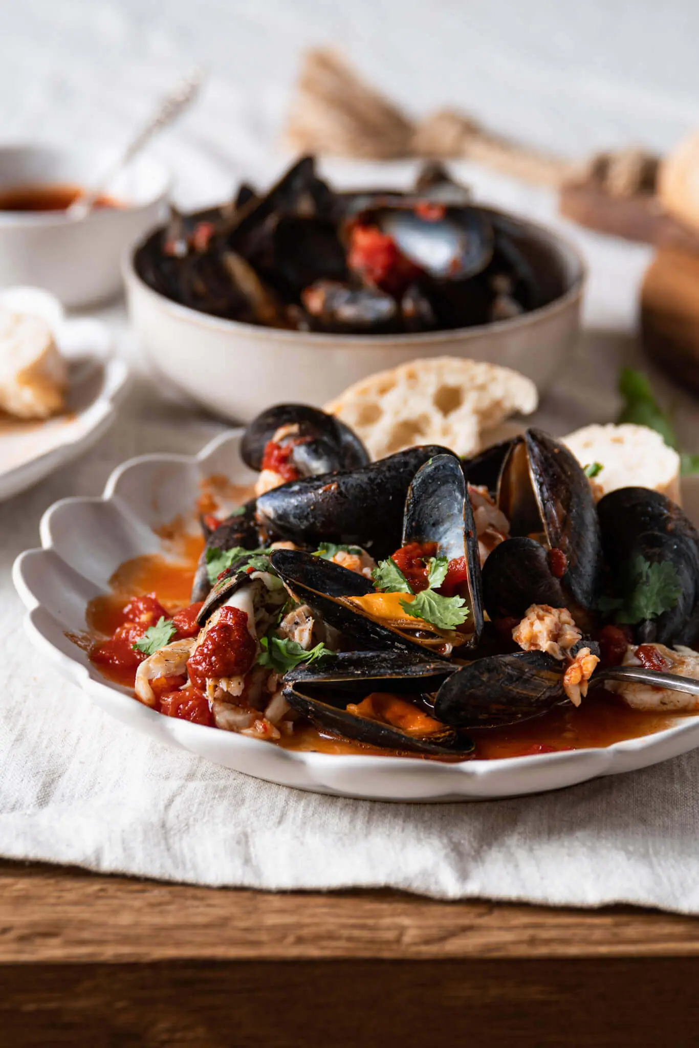 De combinatie van mossel en kabeljauw is al heel lekker, maar wat dit gerecht meer verrassend maakt is de harissa. Harissa is een frisse licht pittige kruidenpasta en past heerlijk bij heel veel gerechten. Zo ook in dit stoofpotje. Door een beetje harissa aan de tomatensaus toe te voegen geef je het gerecht zoveel meer interessante smaken! Persoonlijk hou ik wel van een beetje pittig, maar je kunt zelf inschatten hoeveel je wil toevoegen afhankelijk van hoe pittig je het wil hebben.