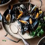 Mosselen in een witte wijnsaus met spekreepjes en creme fraiche