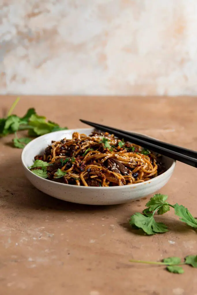 Het vlees zelf maken we niet pittig, maar eerder kruidig met een duidelijke komijn smaak. De pit komt pas met de saus van de noodles en kan je makkelijk zelf bepalen. Het is niet zo pittig als dandan noodles, dus maak je geen zorgen dat deze verhoudingen te heftig zijn. Qua structuur is het heel fijn want het vlees valt natuurlijk helemaal uit elkaar.