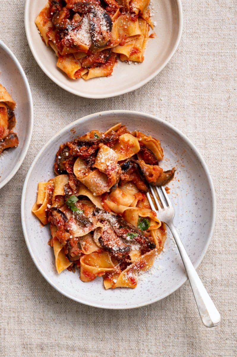 Ik vind melanzane alla parmigiana fantastisch lekker dus dacht ik, waarom maak ik hier geen pastagerecht van. Je kunt er zelfs een ovenpasta van maken en dan serveren met mozzarella erbij, maar ik wilde mijn pasta iets lichter houden en dus heb ik enkel voor parmezaan gekozen. Alsnog heeft het die typische melanzane smaak.