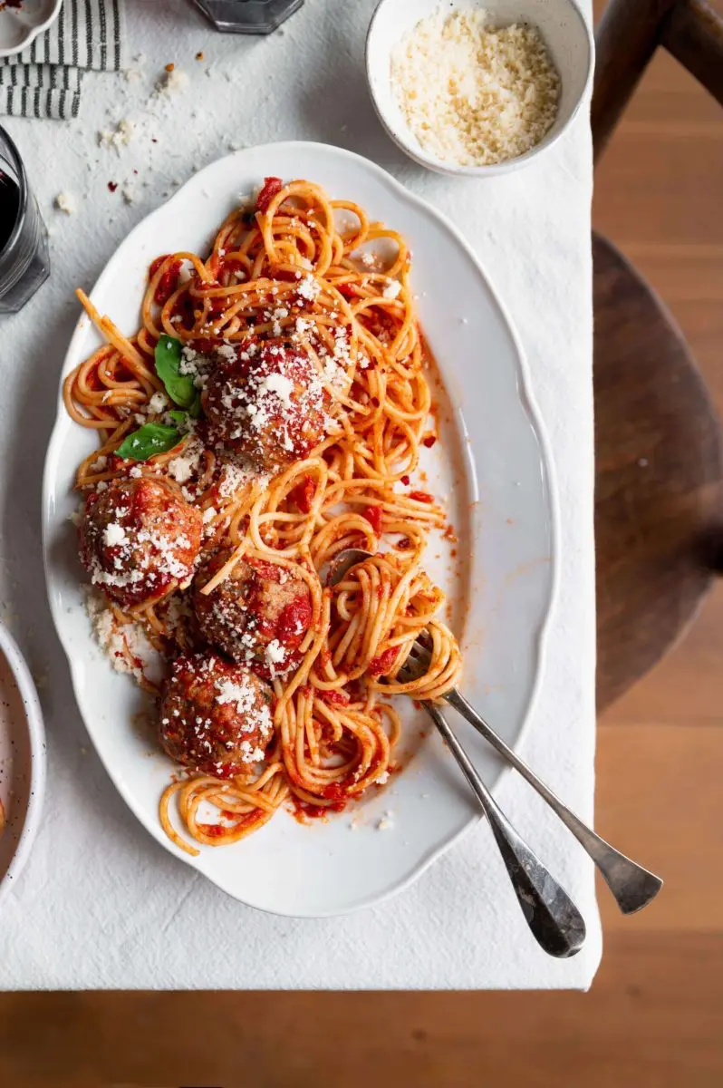 Wanneer je dit serveert met spaghetti, kook de spaghetti dan eerst niet niet al dente en laat dan verder in de saus met de gehaktballen doorkoken. Dit zorgt ervoor dat de pasta veel meer smaak heeft dan wanneer je op het laatst even snel de saus met de spaghetti mengt.