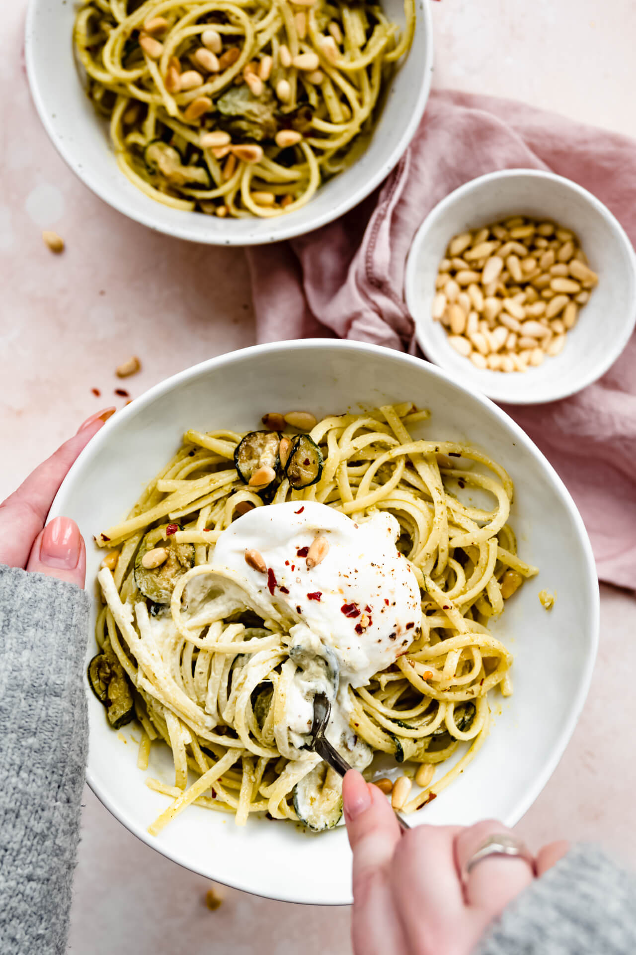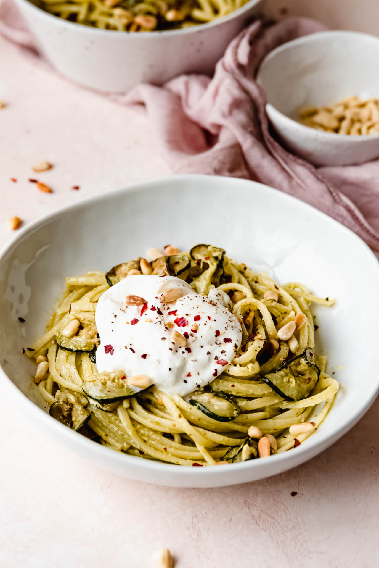 Burrata is eigenlijk een romige variant van mozzarella, maar werkt hier heel goed samen ook. In mijn pasta pesto recept voeg ik creme fraiche toe, maar dat hoeft hier niet omdat de burrata lekker door de pasta heen smelt en voor die romigheid zorgt. Hier gebruik ik in plaats van één grote burrata een mini variant, zoals deze.