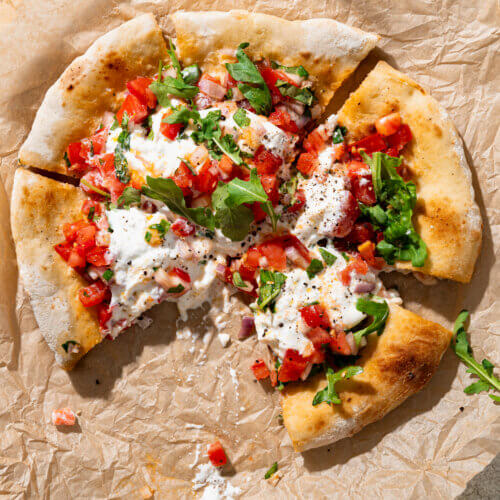 Deze pizza bruschetta met burrata combineert het beste van twee Italiaanse klassiekers: knapperige pizza en frisse bruschetta. Het resultaat is een pizza die zowel hartig als fris is, met sappige tomaten, knoflook, basilicum en romige burrata bovenop een goudbruin gebakken pizzabodem.