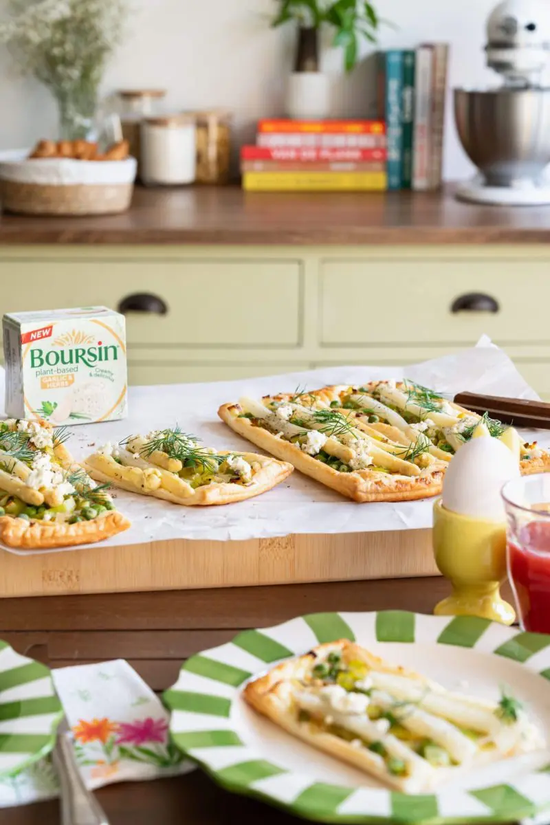 Plaattaartjes met plantaardige Boursin, prei, erwten en asperges