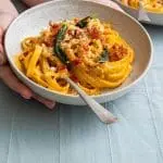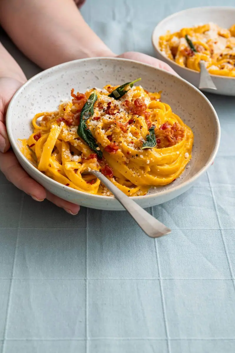 Vandaag heb ik een heerlijke winterse pasta voor je, Pompoenpasta met salie en porchetta. Ik ben lui geweest en heb pompoenpuree uit blik gebruikt. Is niet altijd even makkelijk om te vinden, soms zie ik het weleens bij een toko staan en Koro verkoopt het sowieso.