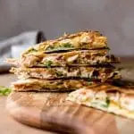 Hier heb ik gebruik gemaakt van bloemtortilla’s. die vind ik lekkerder dan mais tortilla’s als ik heel eerlijk ben. Wil je graag zelf tortilla’s maken? Het recept staat in Vers Deeg, naast een heerlijk recept voor een andere soort quesadilla (en ook nacho’s, fajita’s, een spinazie/garnalen dip en veel meer).