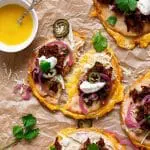 - Verdeel wat kool, pulled pork, rode ui, jalapeno, creme fraiche en koriander eroverheen en serveer direct met de hotsauce
