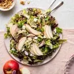 Voor deze salade schil ik de appels niet, want in de schil zit 50% van de vitamine. Enkel wassen is dus voldoende! Verder is 1 appel al voldoende voor een kwart van de dagelijkse behoefte aan vitamine C, vezels voor de spijsvertering, antioxidanten om de huidveroudering te bestrijden, 80% water voor de hydratering en suiker voor de energie. Pink Lady® appels hebben verder trouwens heel sappig vruchtvlees en hebben de perfecte mix tussen zoet en zuur. Perfect om dus los te eten, maar ook heel lekker in een salade.