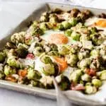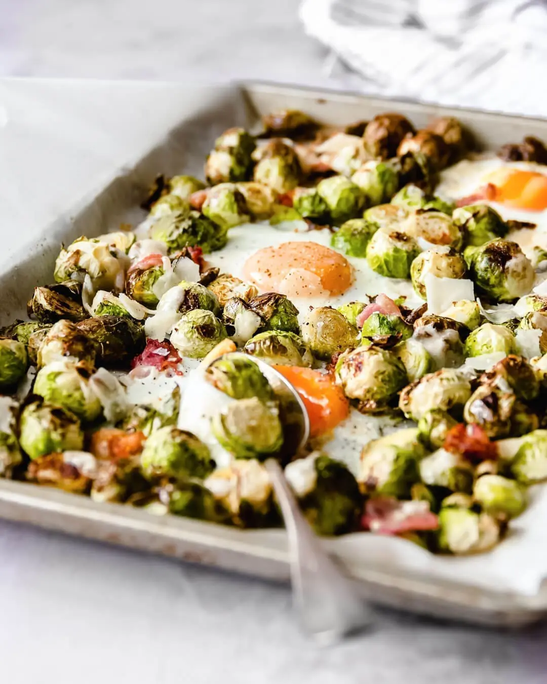 - Haal de spruiten uit de oven, maak 4 kuiltjes en doe hier voorzichtig de eieren hierin, verdeel de parmezaanse kaas over de spruiten en bak nog eens 10 minuten af.