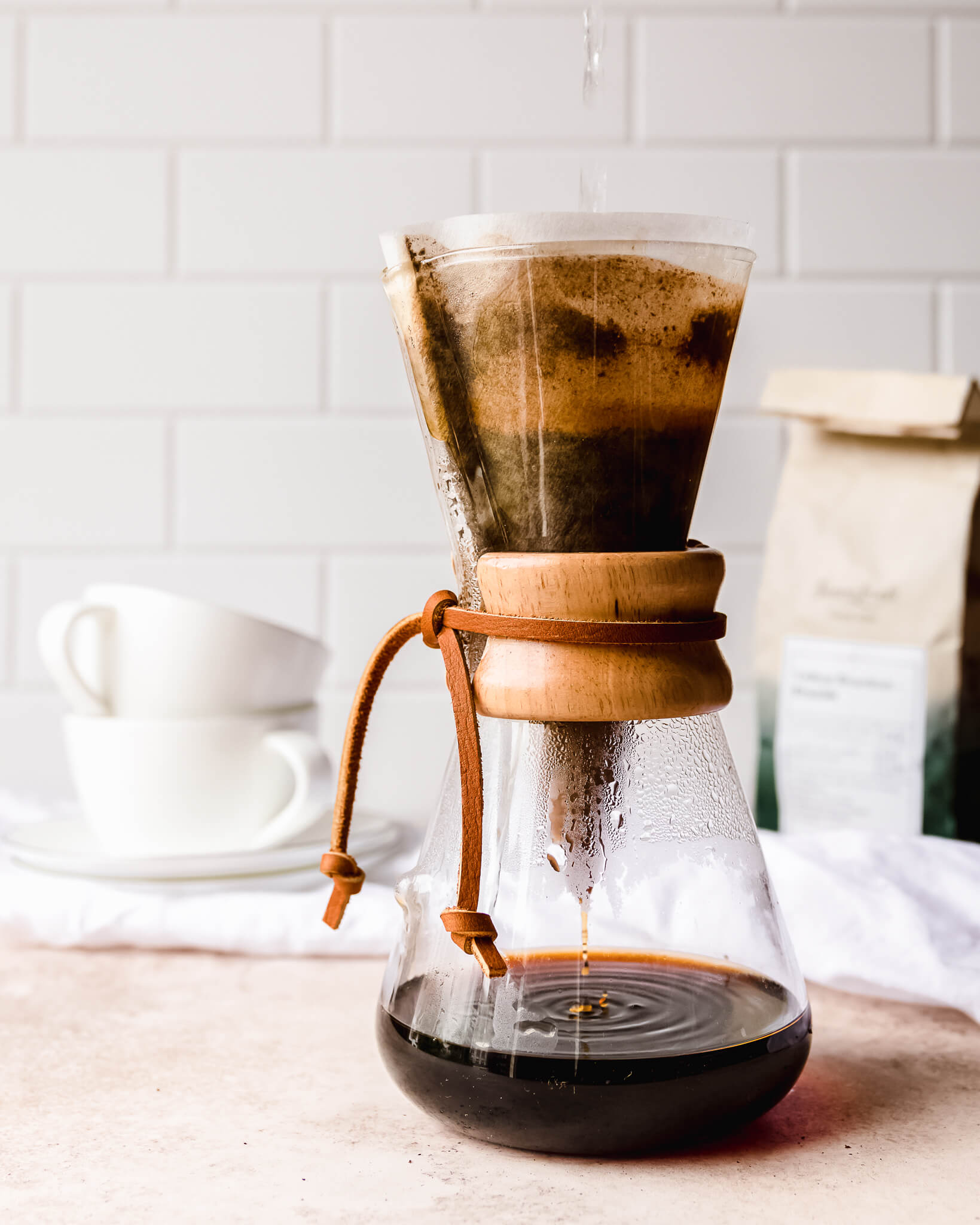 - Giet het water uit je Chemex, dit kan met de filter er nog gewoon in.