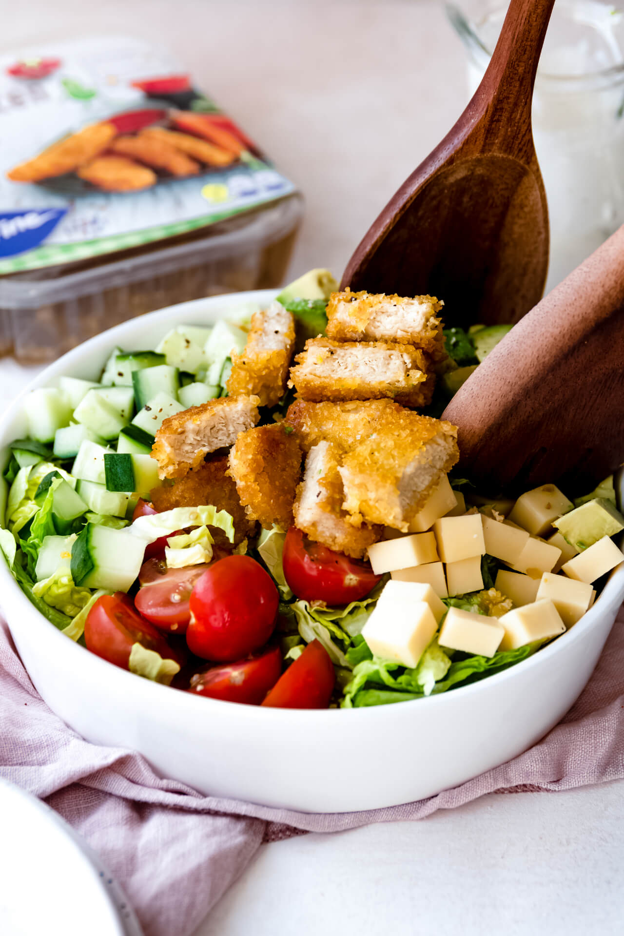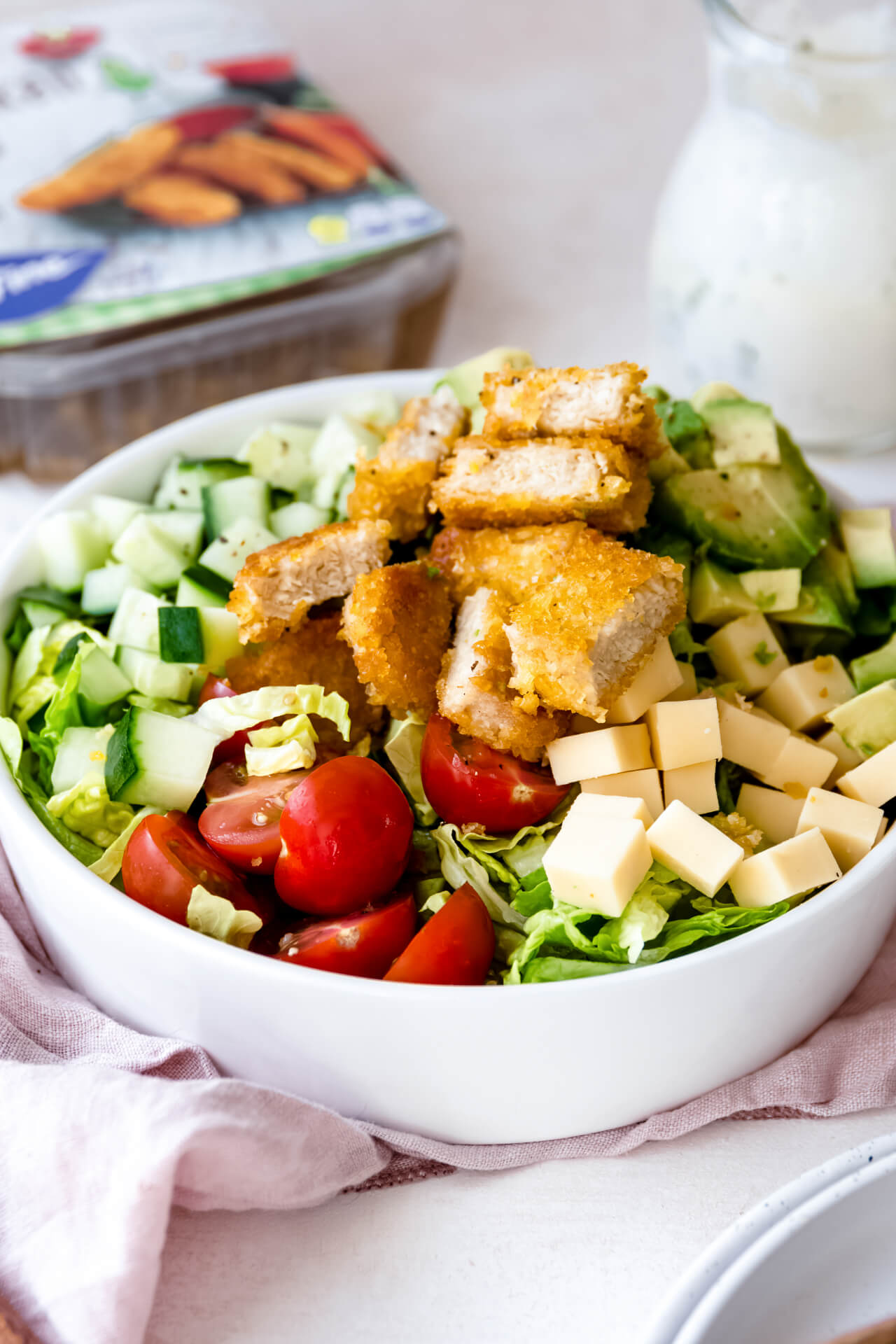Dit is eigenlijk een fancy naam voor een relatief simpele salade. Normaal gesproken gaat hier gebakken kipfilet én bacon doorheen, maar ik heb er dus krokante SoChicken van gemaakt. Ik vind het krokante een hele fijne tegenhanger van de zacht structuren van de sla, avocado en kaas.