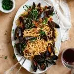 Ik ben dol op mosselen en heb ondertussen al heel wat recepten online staan, zoals deze saffraanrisotto met mosselen. Wat ik fijn vind aan mosselen, is dat ze zo lekker veelzijdig zijn. Je bent misschien wel bekend met het standaard, maar heerlijke, mosselpannetje? Zelf vind ik het lekker om te verwerken door een gerecht heen, zoals hier met spaghetti. Een snel en makkelijk recept dat in slechts 20 minuten op tafel staat.