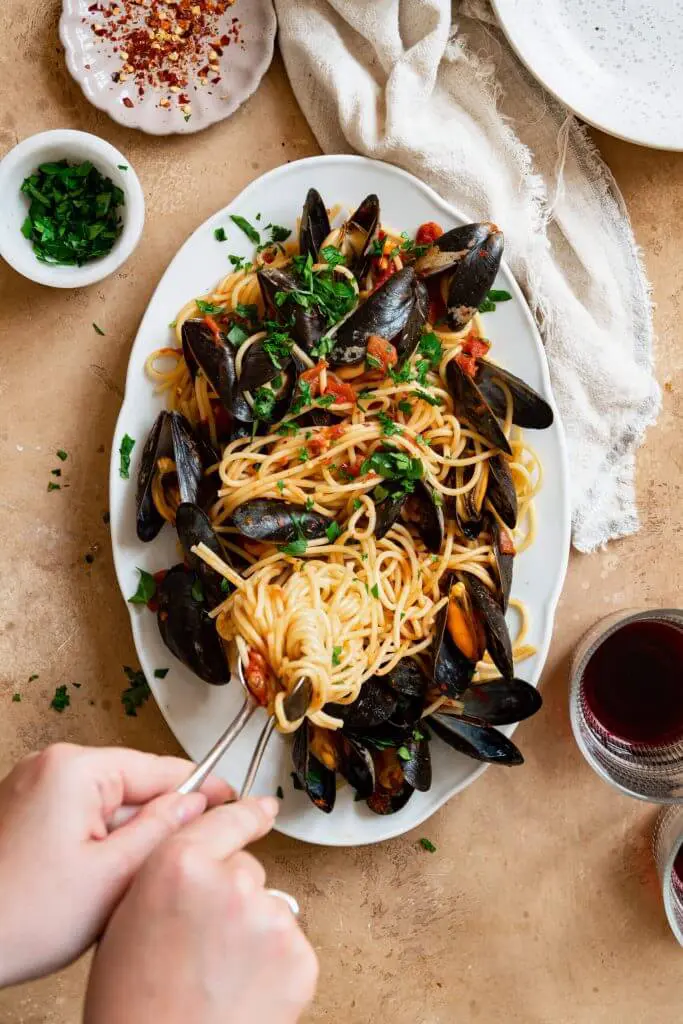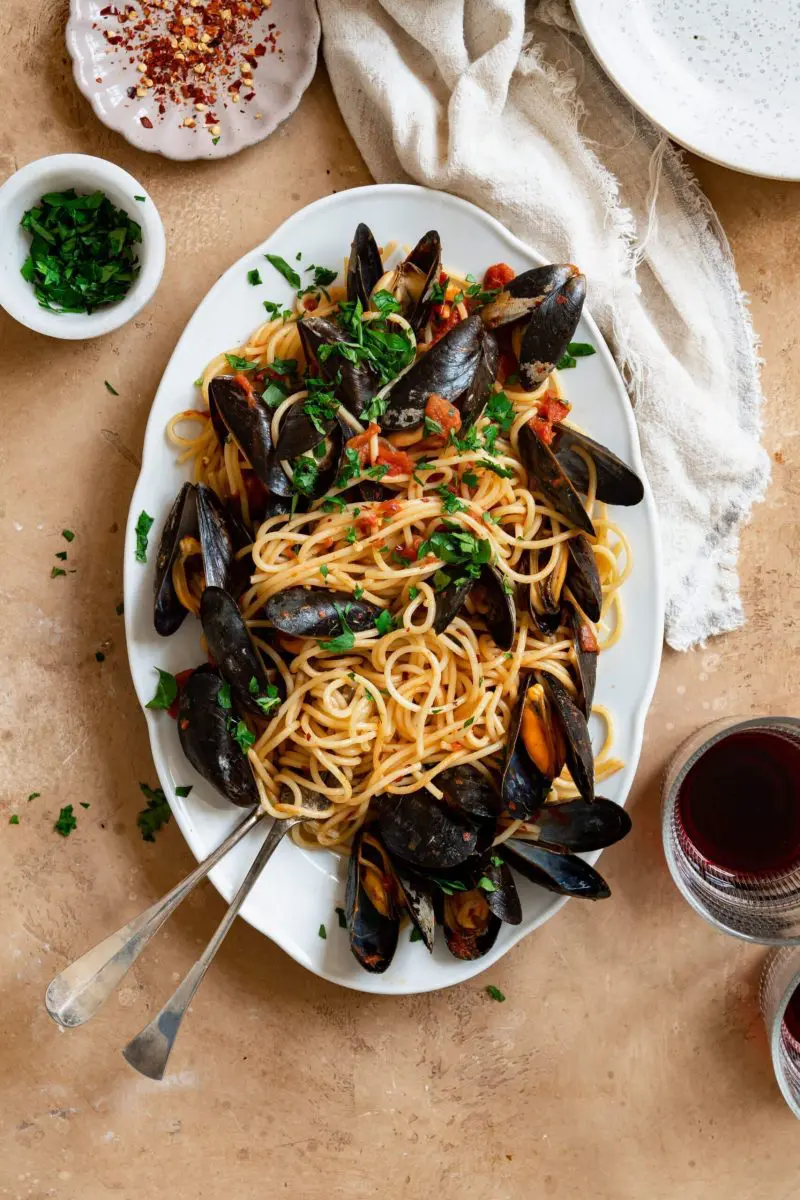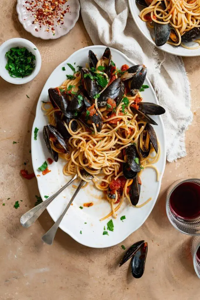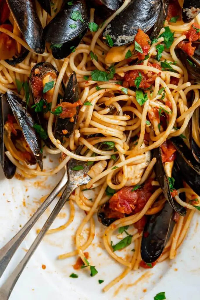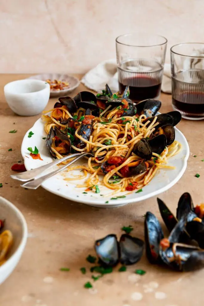 Spaghetti met mosselen in een pittige tomatensaus