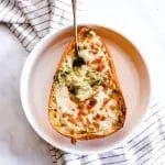 - Strooi geraspte belegen kaas en geraspte mozzarella over de pompoen en zet nog even terug in de oven totdat de bovenkant mooi goudbruin is.