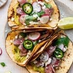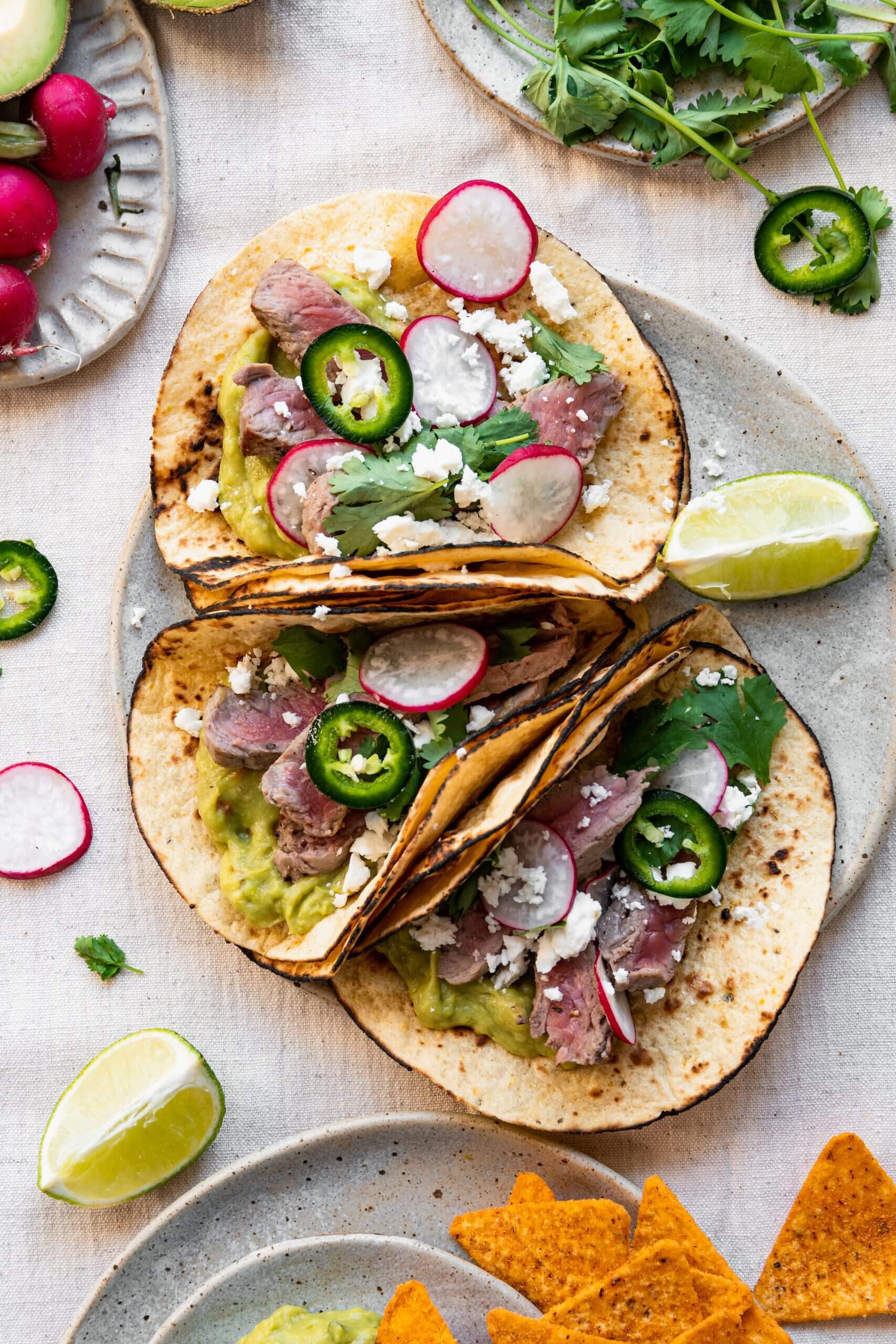 - Verdeel wat van de avocado crème over de tortilla’s, dan wat biefstuk, radijs, jalapeno, koriander en wat verkruimelde feta. Dien direct op.