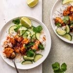 Ik ben de laatste tijd dol op rijsbowls met frisse groenten en een proteïne, zoals deze sweet chili kip en zalm teriyaki.