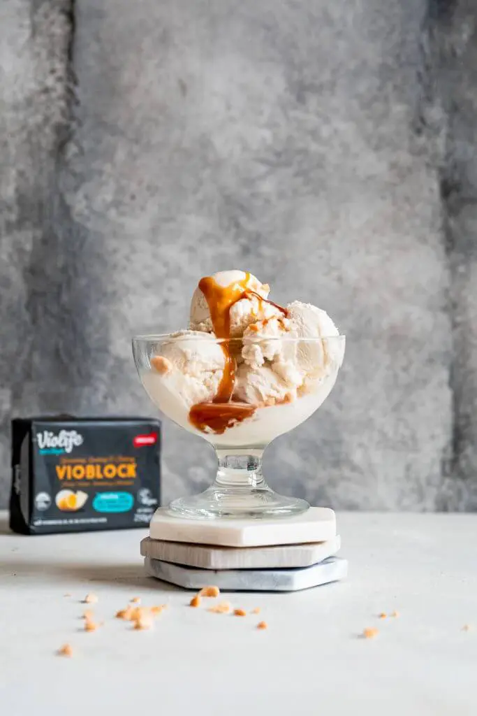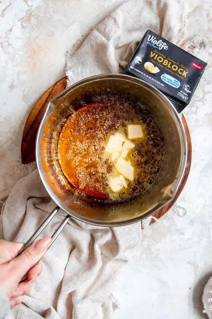 Vanaf nu ligt VIOBLOCK in de Nederlandse supermarkten. Wellicht dat je al bekend bent met Flora Plant, maar deze 100% plantaardige roomboter is samengegaan met Violife en heet dus vanaf nu VIOBLOCK. Je herkent hem aan de kenmerkende donkere verpakking. VIOBLOCK heeft de smaak van roomboter en je kan deze 1:1 vervangen. Ik heb dit zelf al eerder getest met vegan croissants en die waren heerlijk. VIOBLOCK is zeer veelzijdig en kan gebruikt worden om mee te smeren, koken, bakken en BBQ’en. Dit keer wilde ik een fijne, romige karamelsaus maken voor in mijn sundae, dit kan dus heel gemakkelijk met deze plantaardige boter.